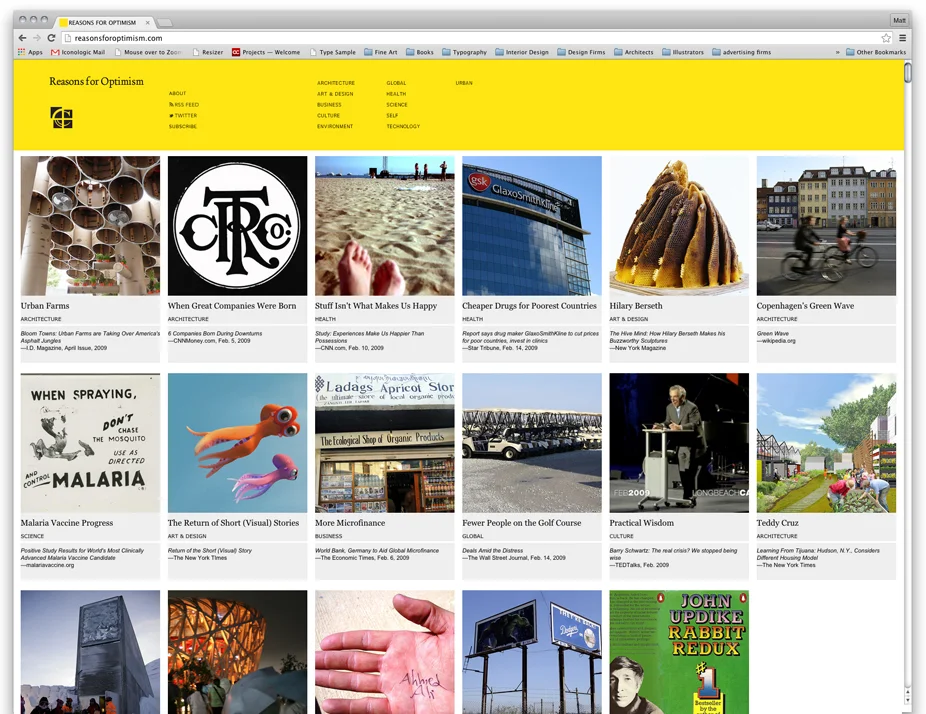 For eight years, Reasonsforoptimism.com kept the bad news cycle in perspective by highlighting the best of what's happening everywhere around us. Developed for national architecture firm Cooper Carry, the site reminded current and potential clients "it's easy to forget that in today's not-so-optimistic world real progress continues, beauty appears, brave new worlds are explored and creativity flows". And look who picked up on the idea. • Scope: Concept, design, development, content for first year